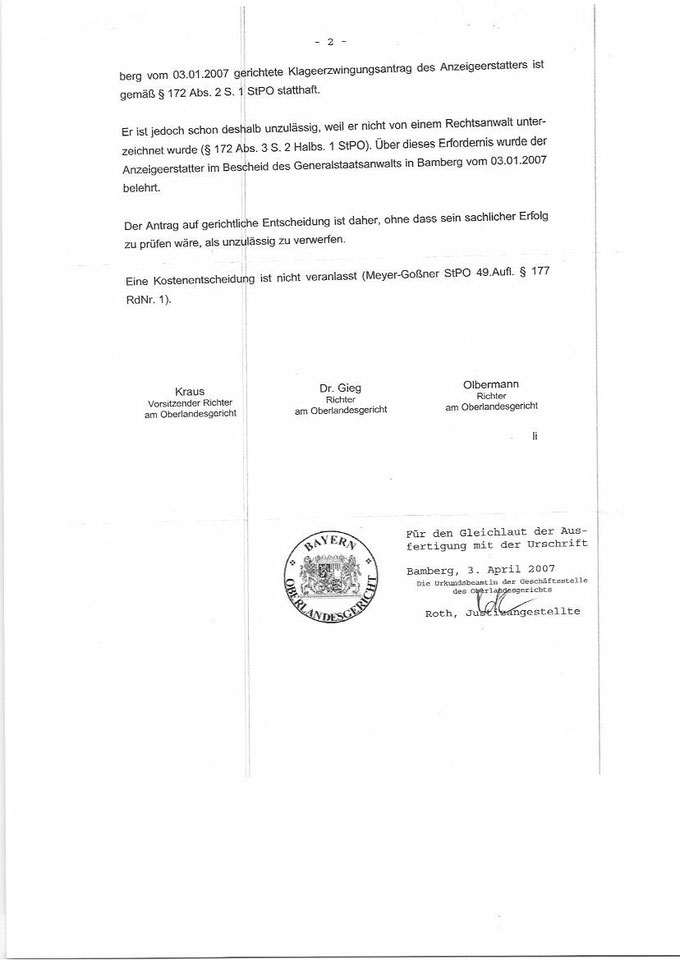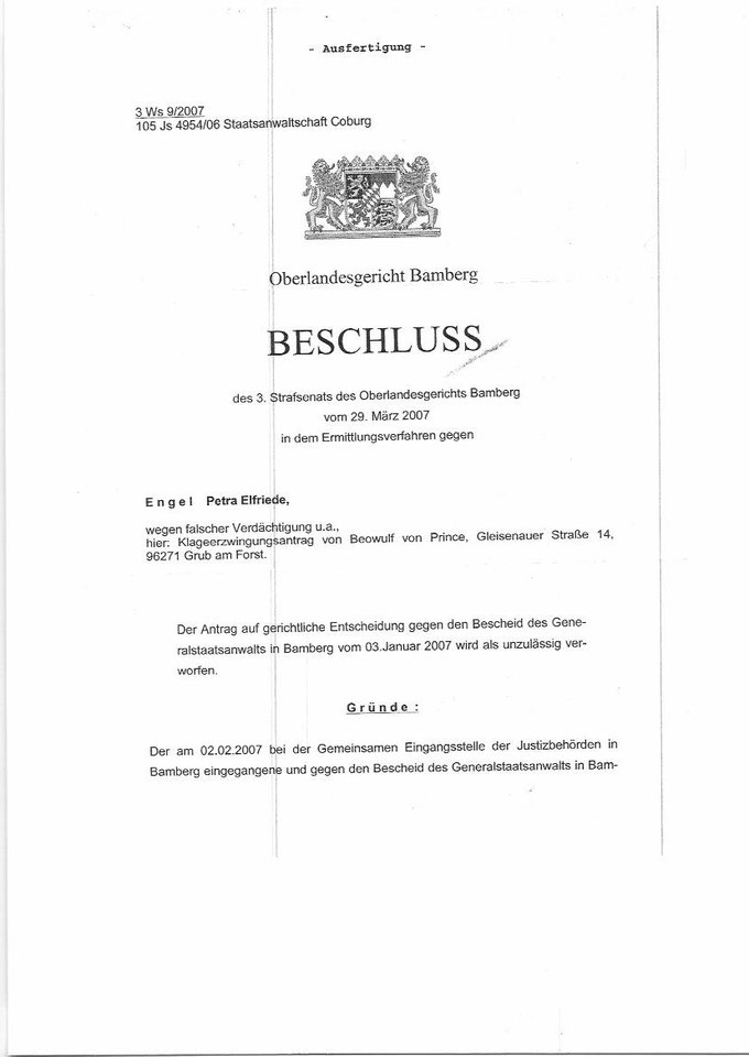 Beweis A1: Beschluss des Oberlandesgerichts Bamberg vom 29.03.2007