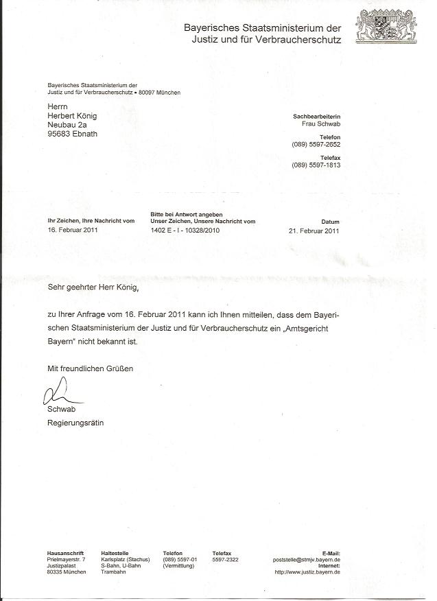 Antwort vom Bay. Staatsministerium der Justiz vom 21.2.2011 auf die Frage, ob es ein Amtsgericht Bayern gibt....